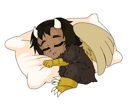 a drawing of a monster with horns and wings sleeping on a pillow