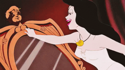 Vanessa gazes into a mirror, revealing Ursula's reflection in Disney's The Little Mermaid.
