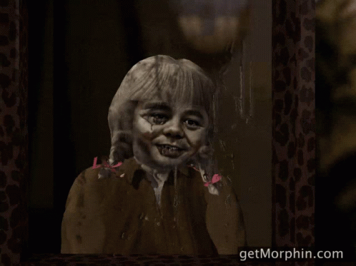 A creepy, morphed image of a girl with pigtails in a decorative frame, associated with getMorphin.com.