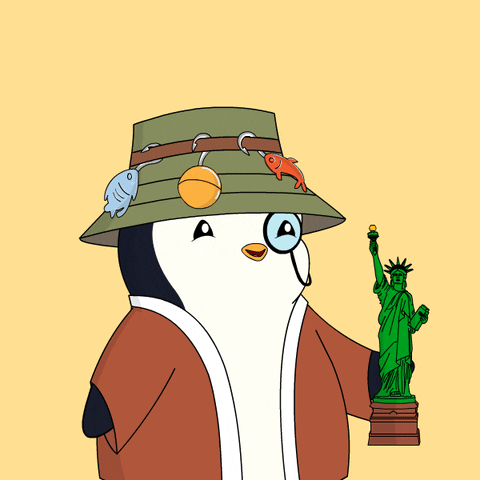 A cartoon Pudgy Penguin, wearing a fishing hat and monocle, proudly holds a miniature Statue of Liberty.