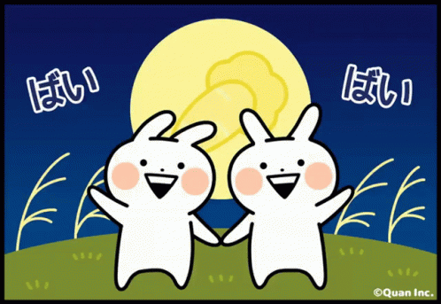 Usagyuuun characters celebrate Mid-Autumn Festival under a full moon, waving happily with Japanese text.
