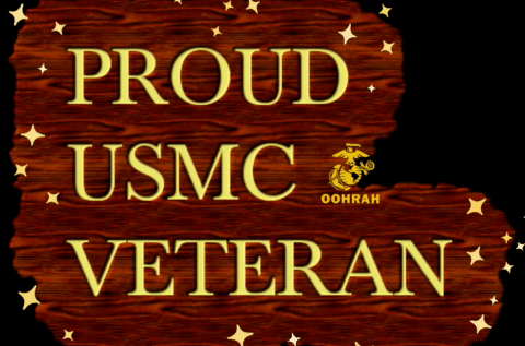 A rustic wooden sign proudly displaying 'PROUD USMC VETERAN' in gold letters, adorned with the USMC emblem and 'OOHRAH'.