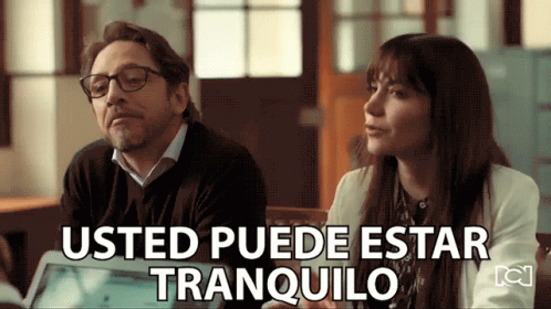 A man and a woman sit at a table, with the woman reassuring the man, saying "You can be calm, count on that."