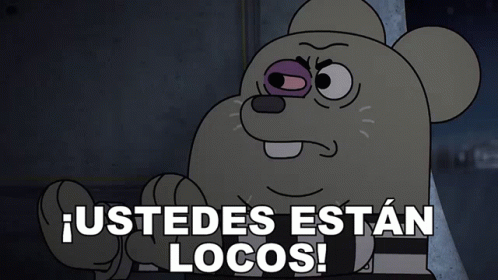 A character from The Amazing World of Gumball, with a black eye, looks distressed and exclaims 'You are crazy!' in Spanish.