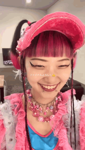 Jpop artist Utaha with vibrant pink hair and hat, giving a cheerful thumbs up and smiling brightly.
