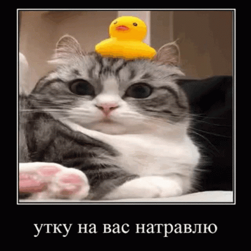 A cute cat with a rubber duck on its head, accompanied by the Russian meme 'I'll set a duck on you'.