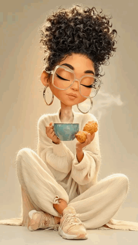 A charming animated girl with curly hair and glasses enjoys a warm cup of coffee and a pastry in a cozy morning scene.