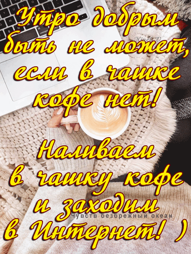 A cozy morning scene with a hand holding a coffee cup next to a laptop, with Russian text overlay.