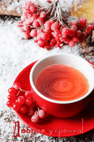 A hand drops a berry into a red cup of tea, surrounded by snow and berries, with 'Good morning' text.