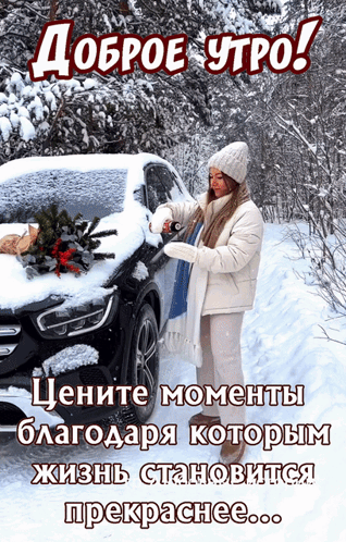 A heartwarming 'Good Morning' message with beautiful winter scenes, including coffee, hot chocolate, and snow.