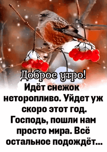 A bird perches on a snowy branch with red berries, accompanied by a 'Good Morning' message and a winter verse.