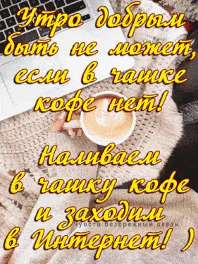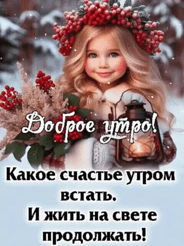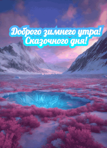 A beautiful, fantastical snowy landscape with a glowing blue pool and a Russian greeting for a good winter morning.