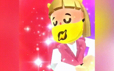 Uunataxisde, a cartoon girl from PKXD, dances with a yellow mask on a sparkling, colorful background.