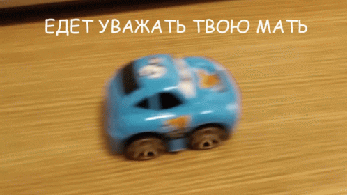 A blue toy car on a wooden surface with the Russian meme text 'GOES TO RESPECT YOUR MOTHER'.