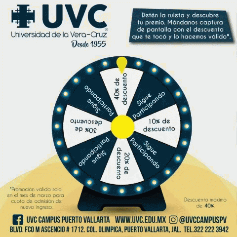 Spin the discount wheel for UVC University admissions in Puerto Vallarta, Mexico, and win up to 40% off.