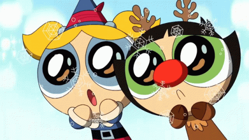 Bubbles and Buttercup, dressed for Christmas, look surprised and impressed by the falling snow.