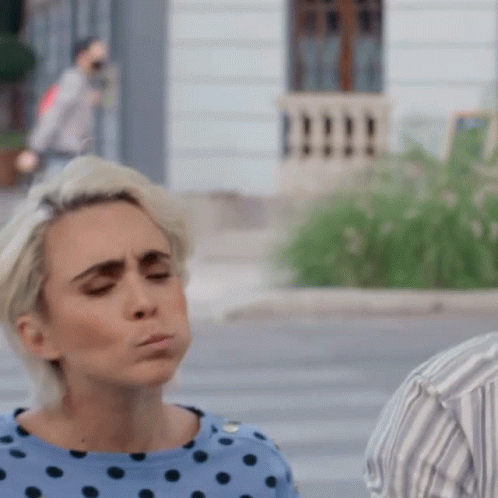 A woman with blonde hair in a blue polka dot shirt enjoys delicious Bets Tacos with an expressive face.