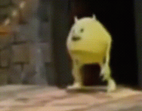 A yellow, blob-like cartoon character with small horns stands on a floor, then opens its mouth wide in a scream.