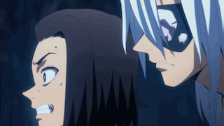 Uzui Tengen and Xiayuda in an intense moment, one character wearing a distinctive eye patch.