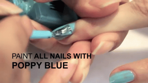 Applying poppy blue nail polish for a V-shaped nail tutorial, showcasing a fresh manicure.