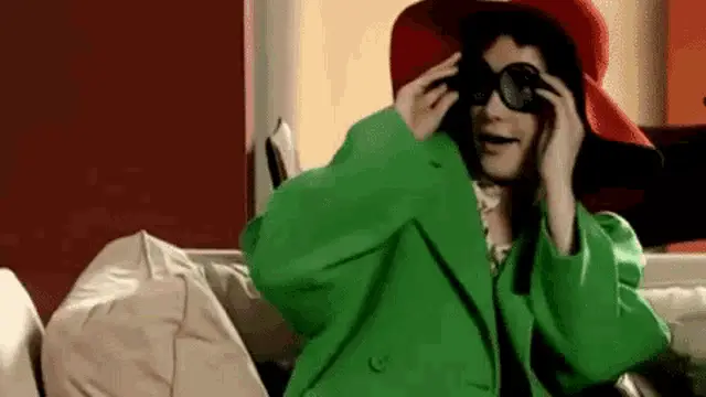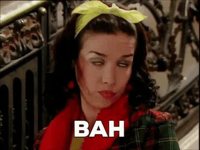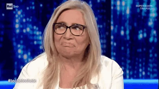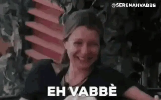 A woman in a green jacket with a yellow necklace looks up with an unconvinced expression, with 'VABBÈ' overlaid.