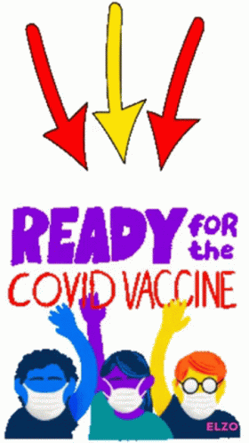 Animated graphic showing three people ready for the COVID vaccine, with arrows pointing down.