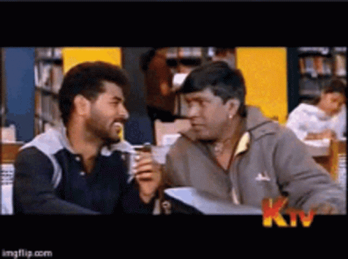 Vadivelu in a comedic scene, asking 'I am your best friend, please?' to another man.