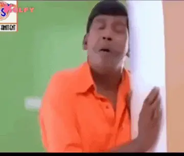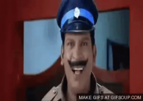 Vadivelu, the famous comedian, laughing heartily while dressed as a police officer with a mustache and blue hat.