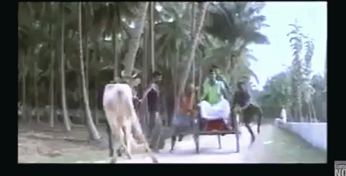 Vadivelu in a hilarious scene, sitting in a cart initially pulled by bulls, then comically pushed by men.