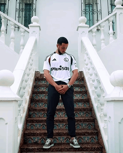 Vahan Bichakhchyan stands confidently on a grand staircase, wearing a white Legia Warszawa football jersey.