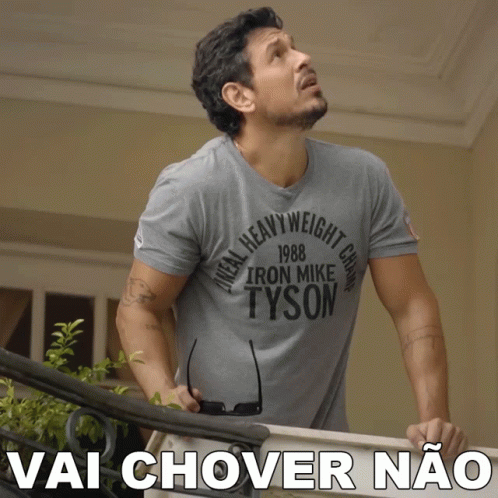 João Vicente De Castro looks up, holding sunglasses, with the caption 'Vai Chover Não' (It won't rain).