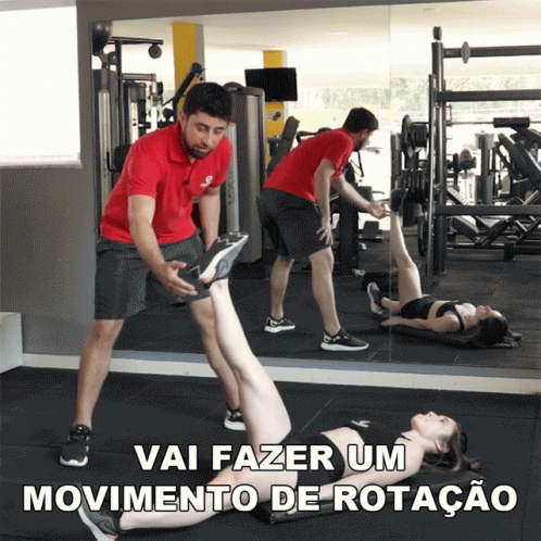 Sandro Lenzi assists a woman with a leg rotation exercise for hip mobility in a gym setting.