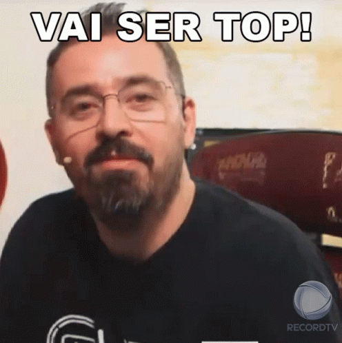 A man with glasses and a beard enthusiastically declares 'Vai Ser Top!' for Power Couple Brasil.
