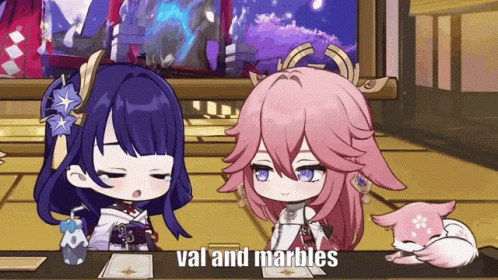 Chibi Raiden and Yae Miko from Genshin Impact discuss 'val and marbles' at a table.
