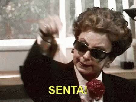 Odete Roitman from Vale Tudo, wearing sunglasses and pointing, emphatically says 'SENTA!' (Sit!).