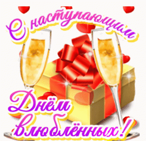 a greeting card in a foreign language with a gift box and two glasses of champagne