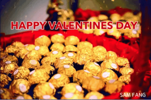 Sam Fang presents a festive display of golden chocolates on a red background, celebrating Happy Valentine's Day.