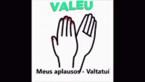 Animated clapping hands with the Portuguese word 'Valeu' and 'Valtatui'.