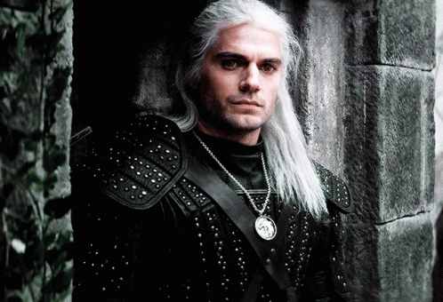 Henry Cavill as Geralt of Rivia from The Witcher, wearing armor and a wolf medallion.