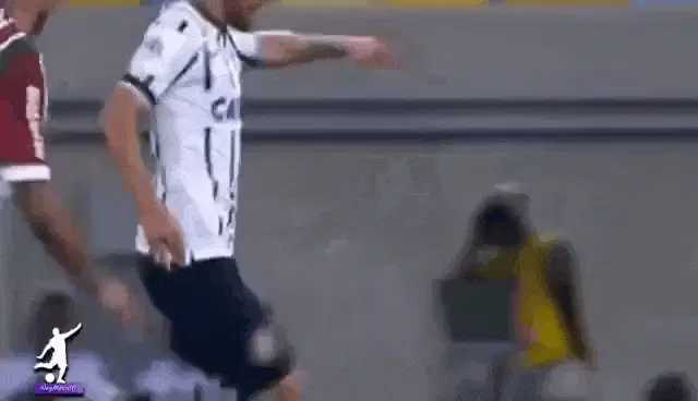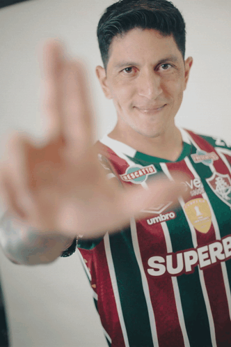 Germán Cano, the Fluminense striker, smiles and makes a hand gesture in his team's jersey.