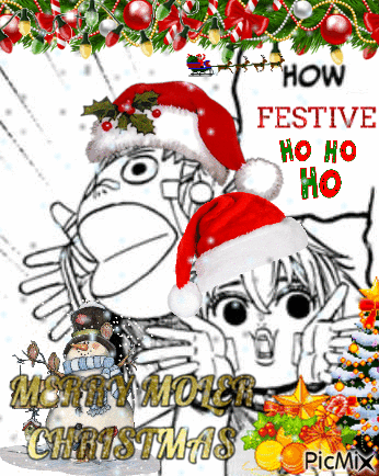 Festive Christmas card featuring Dandadan characters Vamola, Jiji, and Enjoji, with 'Merry Moler Christmas' text.