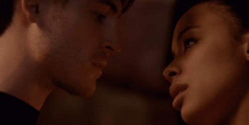 Rose Hathaway and Dimitri Belikov share an intense, close moment in Vampire Academy, eyes locked in romance.