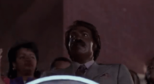 Eddie Murphy, as a vampire in the movie Vampire in Brooklyn, looks up with hands raised in a dark setting.
