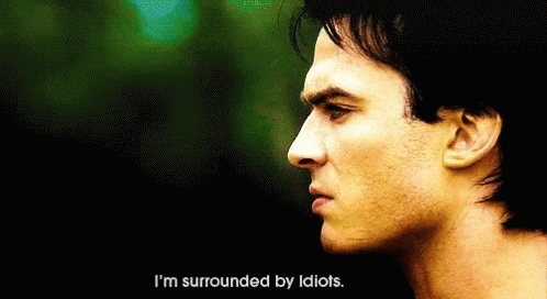 Damon Salvatore from The Vampire Diaries looks on, stating, "I'm surrounded by Idiots."