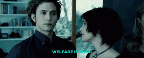 Jasper and Alice from Twilight looking at each other with the caption 'WELFARE IS GOOD' displayed.