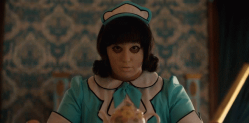 Vancethxt Ahs Dolls features a creepy doll-like maid in a teal costume holding a teapot, evoking an unsettling atmosphere.