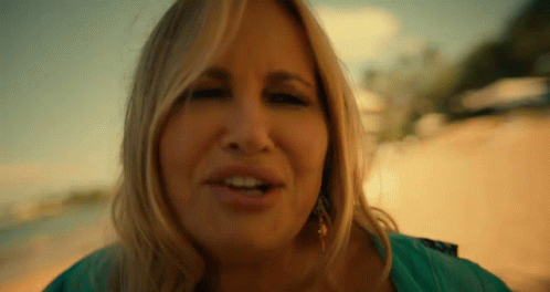 Jennifer Coolidge in a close-up shot on a sunny beach, appearing to speak or sing.
