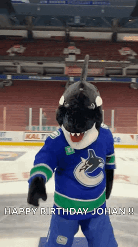 Vancouver Canucks mascot Fin The Whale dances on the ice, wishing Johan a happy birthday.