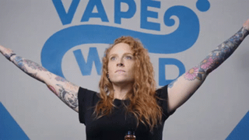 A woman with red hair and tattooed arms stands proudly with her hands raised in front of a Vape Wild sign.