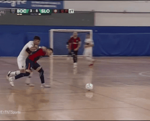 Vaporaki of Boca Juniors in intense futsal action during a match against SLO, score 3-5 in 2nd half.